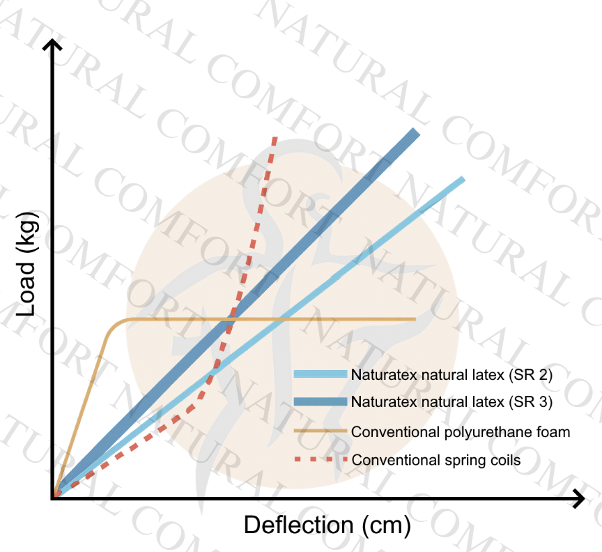Latex rubber has unmatched elastic pushback properties compared to any other padding. Latex exerts a proportional pushback force depending on the weight imparted on it, so no matter the sleeping position latex will fully support you. Unlike memory foam which is a non-supportive slow recovery material, latex responds in real-time to keep your spine in a neutral position.